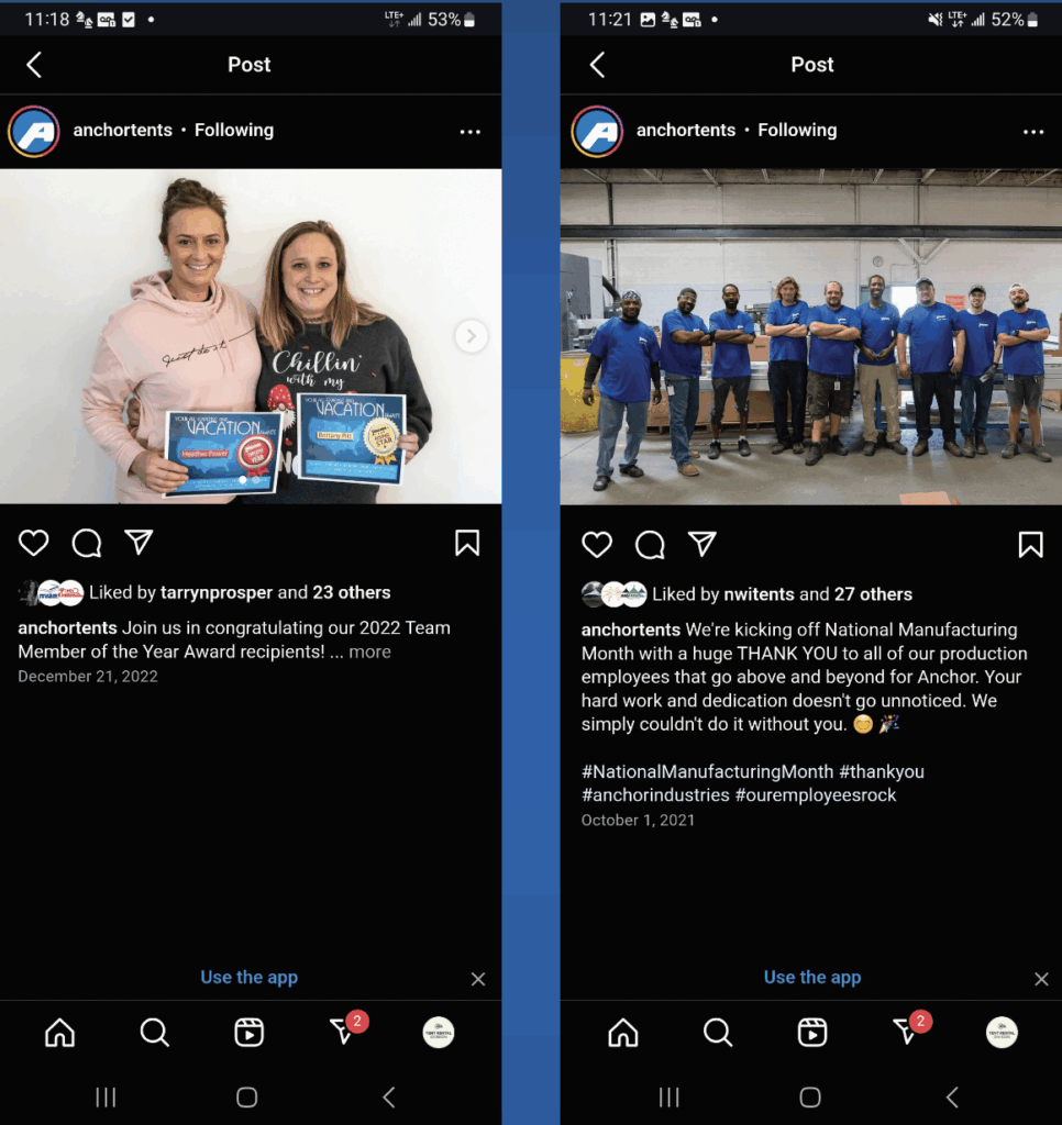 “We’ve also seen unexpected recruiting benefits, a welcome bonus to the effort,” he adds. “We primarily post photos and reels from event installations and some behind-the-scenes footage. We may post company updates when relevant, but not frequently.